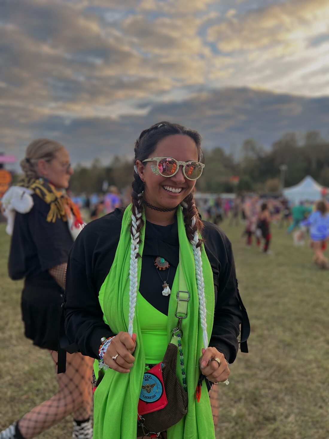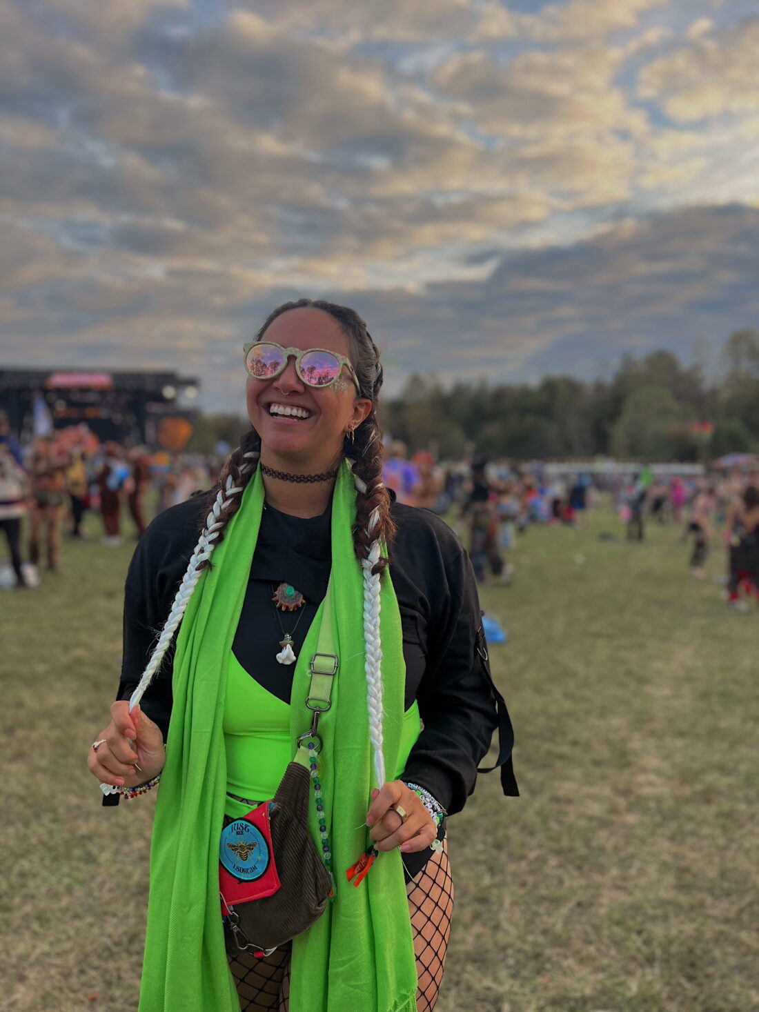 My knee-high Doc Martens were my go-to boots all weekend and I paired this outfit with a matching green pashmina, fishnets, and a cropped hoodie for the cooler weather. I was pretty happy with how it turned out!