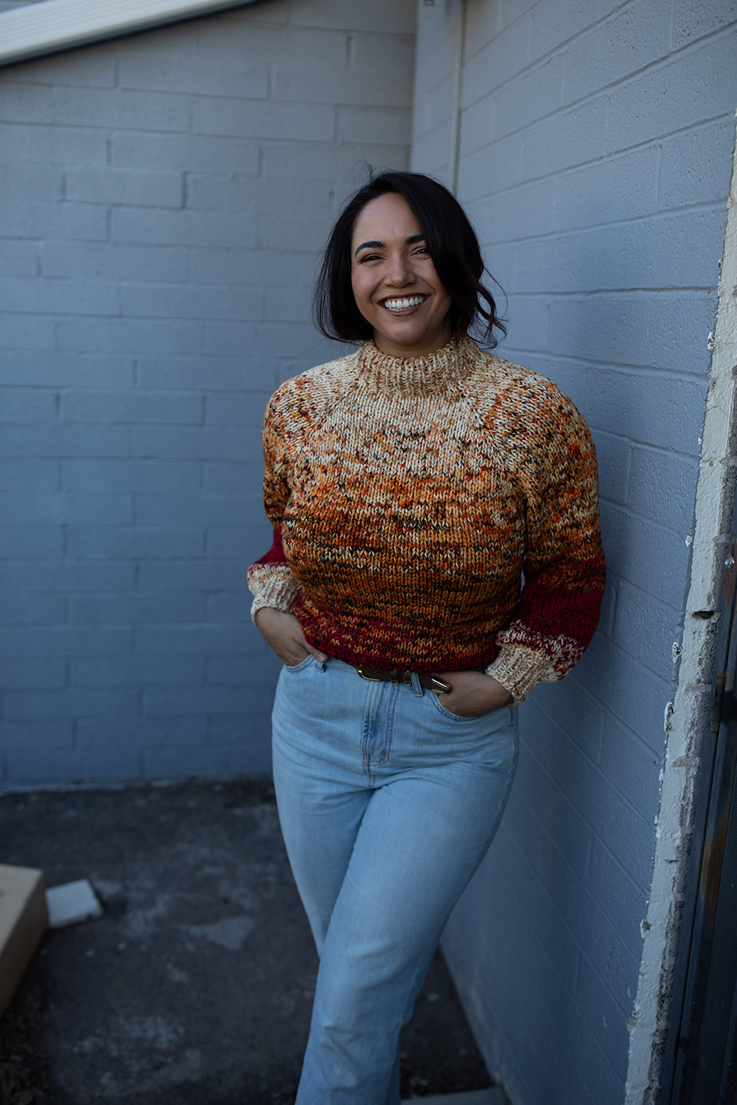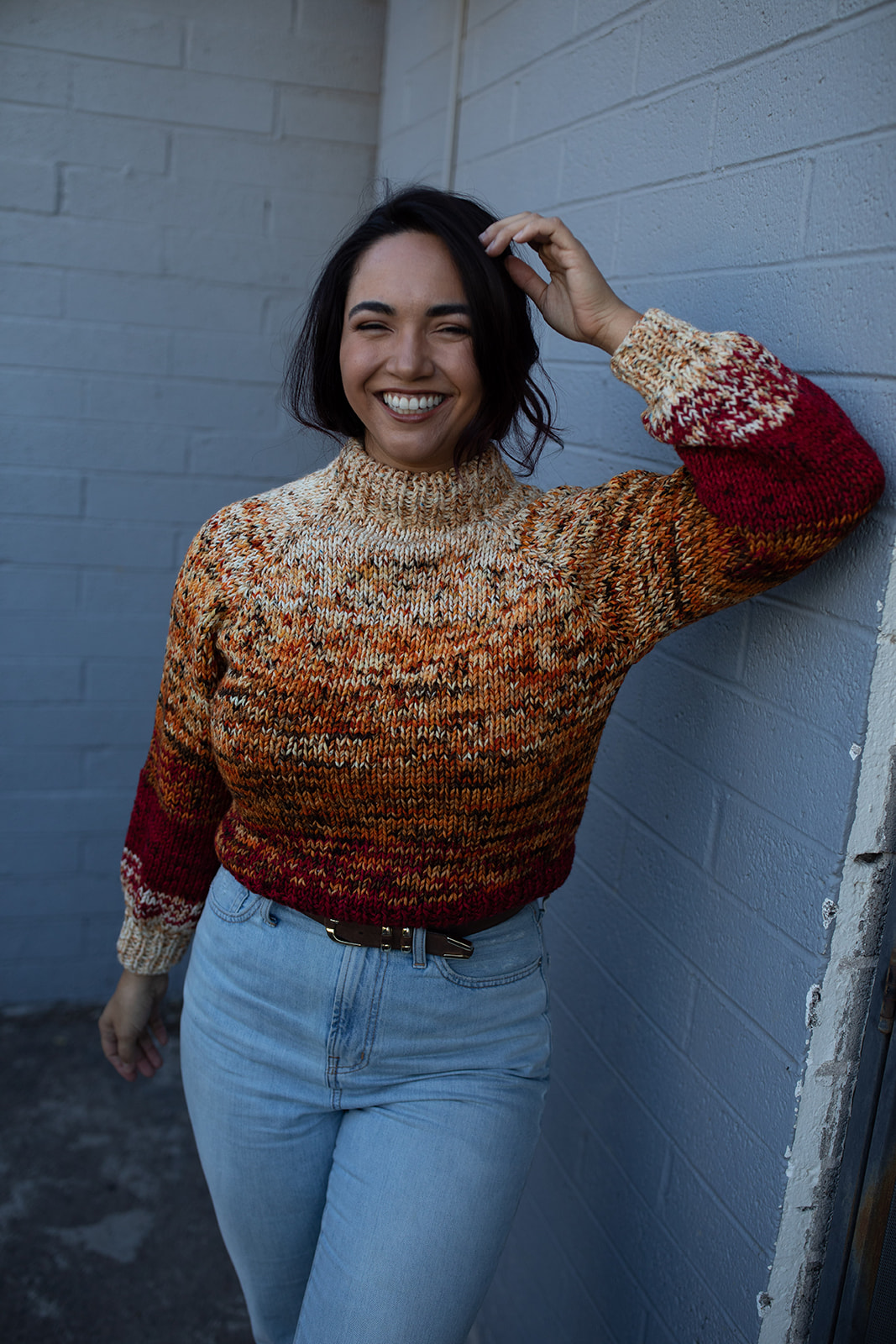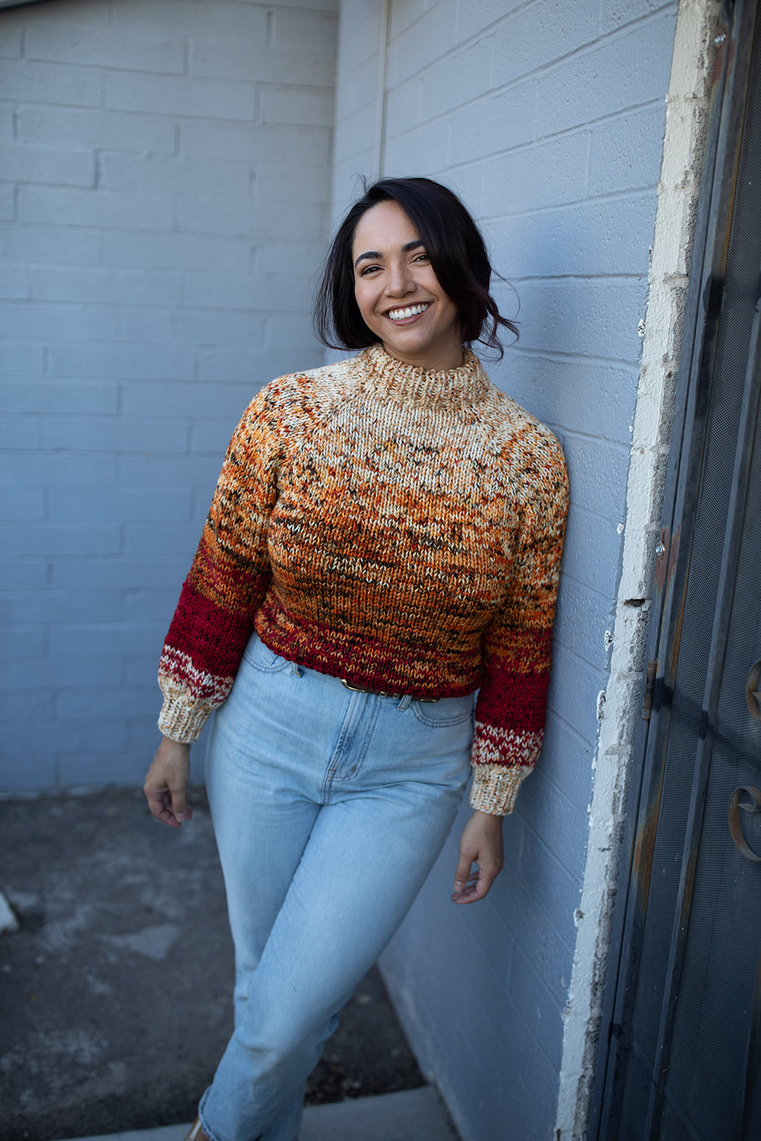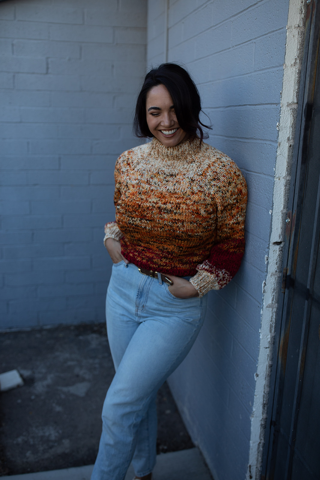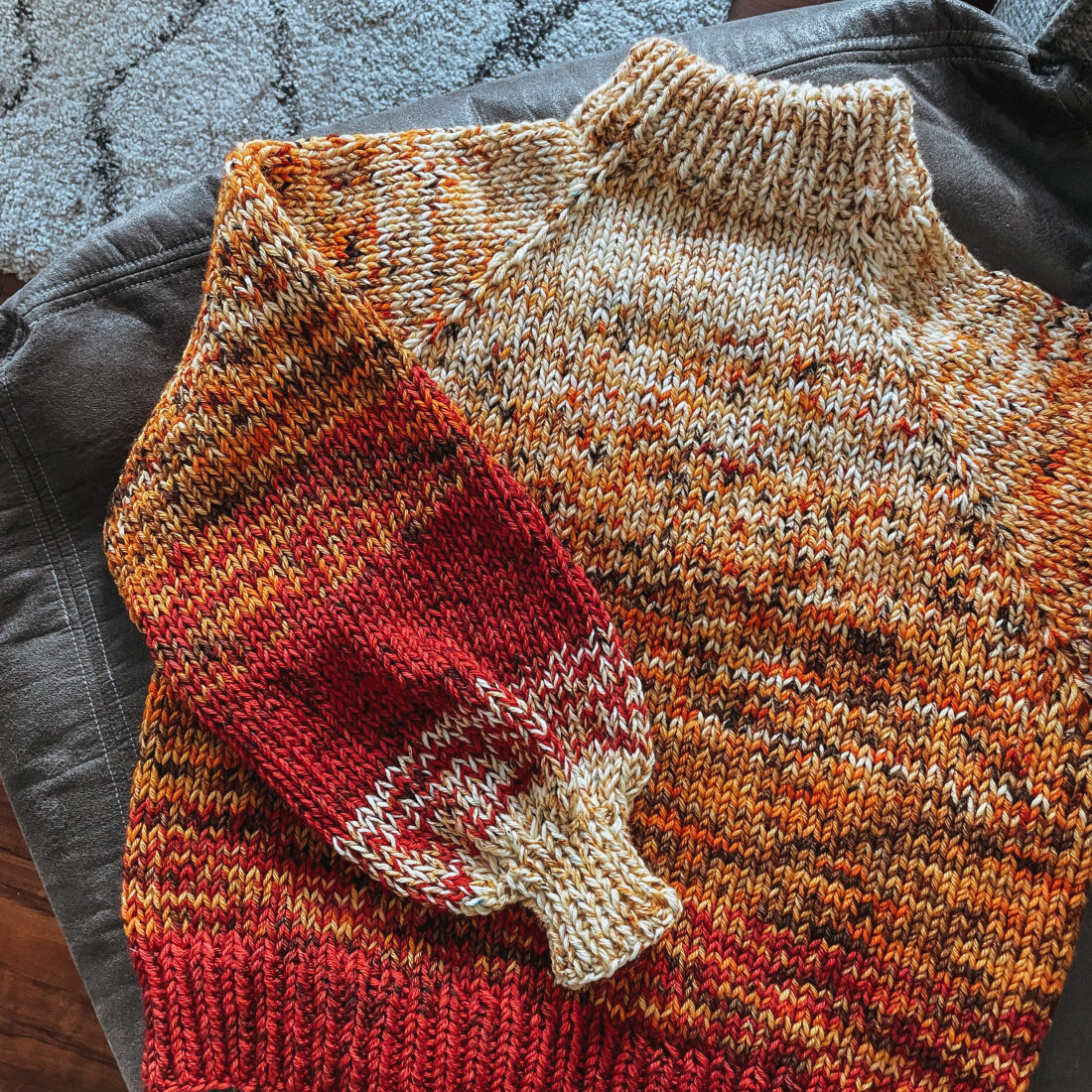 When I was early on in my knitting journey, I fell in love with this fade set from Etsy and searched for a simple pattern that would show off the yarn colors. Enter the Louisiana Sweater by PetiteKnit. This was one of my first top-down knits with raglan increases and my first time doing a folded collar. The end result was exactly what I wanted: a simple silhouette with a chunky stitch that showed off this beautiful fall-colored yarn.
