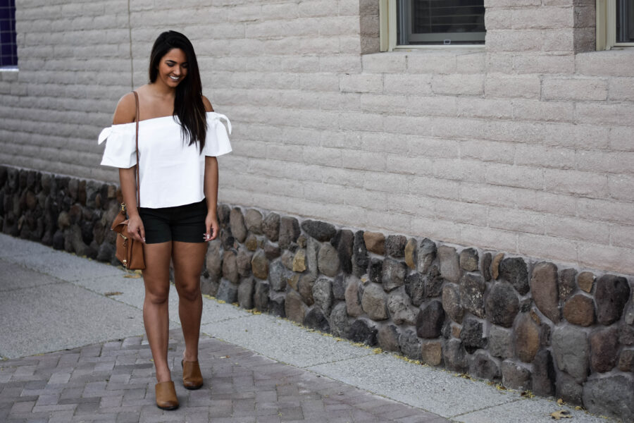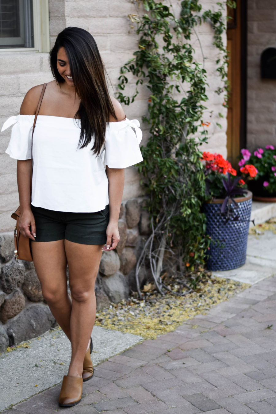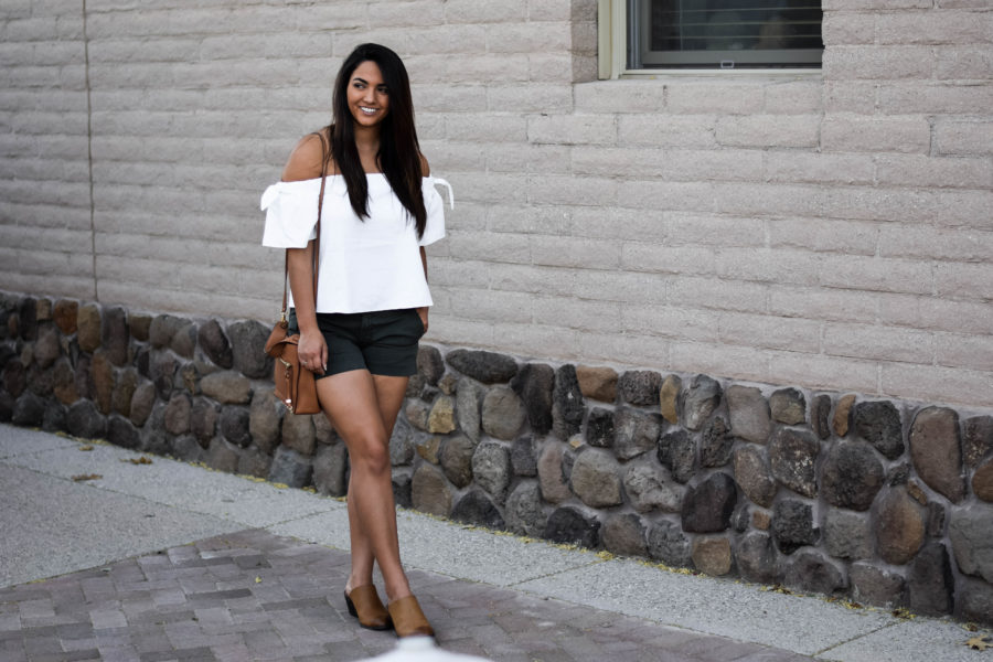 In this outfit, I combined two of the most popular trends lately: mules and off shoulder shirts. The mules are so comfy and only $28 from GG Boutique! I can already tell these will be a favorite of mine, especially with how much I’ve been wearing my other pairs of mules lately. The shirt is from Shop Tobi, and is the perfect off shoulder shirt to wear with denim skirts, skinny jeans, and colored shorts alike! I can already see it now with a wide variety of summer outfits. I’ll be taking this one out a lot this summer, that’s for sure. The shorts are from James Jeans and are possibly the comfiest pair of shorts in my closet right now. They’re a little longer (aka no ‘cheek peek’ in the back) and have just the right amount of stretch to accommodate large thighs and hips! Literally, just what I need! I’m actually debating getting them in white now to replace my old white summer shorts!