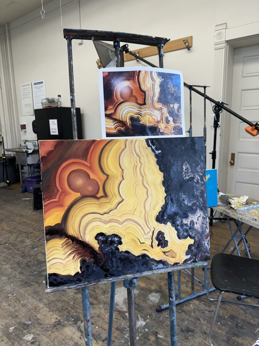 After a few guided classes, I finally decided to check out the Art Student League of Denver for a 4-week beginner oil painting course. I spent the first four classes painting two art pieces, each focused on slices of unique rocks. I focused on a cut of flourite and a cut of fire lace agate. I tried to pick two very different pieces with very different colors and textures to work on different things.