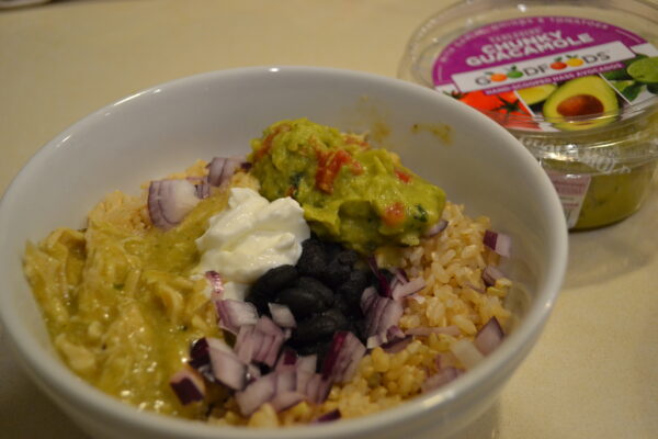 - Serve rice, beans, and chicken mixture warm in a bowl and top with fresh onions, sour cream, and Good Foods Guacamole.
