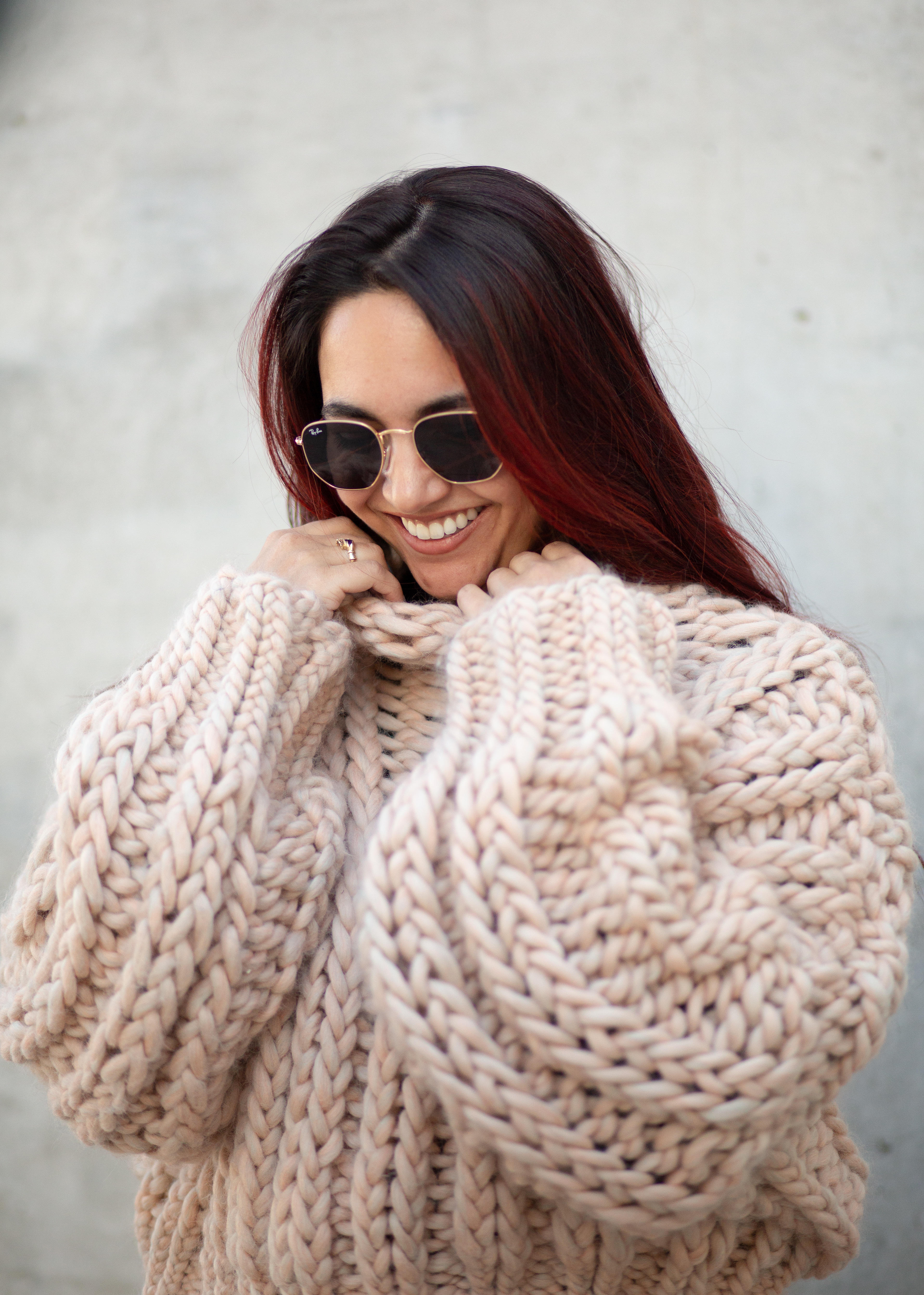 This sweater is knit in four separate pieces and then seamed together. Decidedly, this is not my favorite type of construction for knit sweaters. Personally, I prefer a seamless construction with everything knit in the round. Especially with bulky yarn, the seams can feel like a bit much, and the classic mattress stitch may be more prone to pulling the final constructed pieces. (There are a few easy ways around this, but I don’t think it’s something I knew as a beginner.)